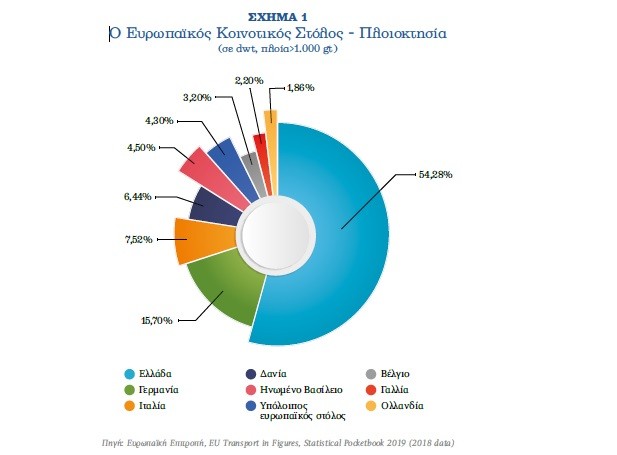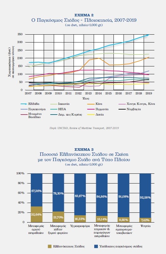 Μολονότι ο πληθυσμός της Ελλάδας αντιπροσωπεύει μόνο το 0,16% του παγκόσμιου πληθυσμού, οι Έλληνες πλοιοκτήτες κατέχουν το 20,67% της παγκόσμιας χωρητικότητας και το 54,28% της χωρητικότητας της Ευρωπαϊκής Ένωσης – ΕΕ. Οι Έλληνες πλοιοκτήτες υπερδιπλασίασαν τη μεταφορική ικανότητα του στόλου τους στο διάστημα 2007-2019, ενώ ελέγχουν: