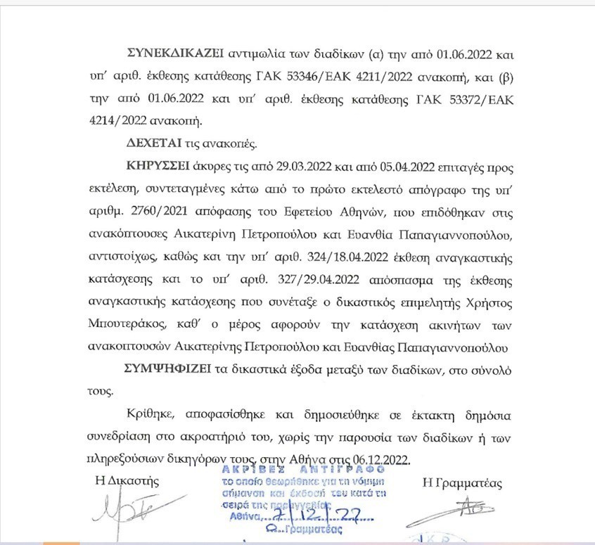 Συγκεκριμένα, αυτή η απόφαση του Τμήματος Υποθέσεων Αναγκαστικής Εκτέλεσης (Διαδικασία Περιουσιακών Διαφορών), η οποία εκδόθηκε την Τρίτη 6 Δεκεμβρίου 2022, κηρύσσει άκυρες τις επιταγές προς εκτέλεση (από 29/3/2022 και 5/4/2022) καθώς και την έκθεση αναγκαστικής κατάσχεσης (από 18/4/2022) κατά το μέρος που αφορούν την κατάσχεση ακινήτων της συζύγου του εκλιπόντος Κων. Αγγελόπουλου, Ευανθίας Παπαγιαννοπούλου και της κόρης της Αικατερίνης Πετροπούλου.