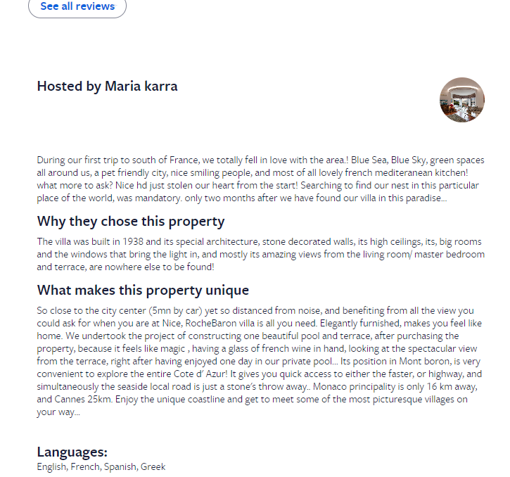 «Η βίλα, ένα κόσμημα αρχιτεκτονικής, διαθέτει μια υπέροχη πισίνα, μια φιλόξενη βεράντα όπου μπορείτε να απολαύσετε ένα υπέροχο ηλιοβασίλεμα με ένα ποτήρι γαλλικό κρασί, έχει εκπληκτική θέα 180 μοιρών στη θάλασσα, το λιμάνι και την πόλη της Νίκαιας. Σε αυτή την εκπληκτική βίλα 4 υπνοδωματίων μπορούν να μείνουν έως και 8 άτομα. Αφεθείτε στον ήλιο και το φως που περιβάλλουν τη βίλα όλη την ημέρα ή αφήστε να παρακολουθήσετε το μαγικό ηλιοβασίλεμα ενώ απολαμβάνετε μια βουτιά στην πισίνα. Η βίλα μας είναι γεμάτη φως και είναι χτισμένη σε πέτρα, σύμφωνα με τα χαρακτηριστικά της περιοχής και το αρχιτεκτονικό στυλ.