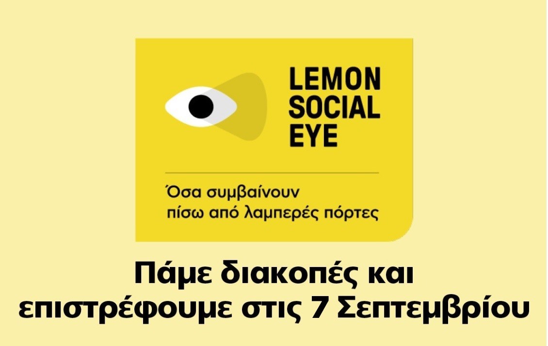 business stories Lemon Social Eye: Πάμε διακοπές – Ξανά μαζί σας στις 7 Σεπτεμβρίου Η στήλη που αποκαλύπτει όσα συμβαίνουν πίσω από λαμπερές πόρτες, πήρε καλοκαιρινή άδεια newsroom 10 Αυγούστου 2024 - 9:00 To Lemon Social Eye αναχώρησε για τις καλοκαιρινές διακοπές του. Θα είναι ξανά μαζί μας στις 7 Σεπτεμβρίου. Lemon Social Eye: