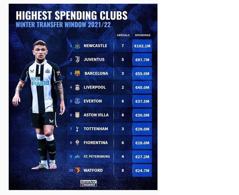 Όλα αυτά, όταν η… ουραγός της βρετανικής Premier League (19η), Νιούκαστλ, με νέο ιδιοκτήτη της εδώ και μερικούς μήνες τον Σαουδάραβα πρίγκιπα Μοχάμαντ Μπιν Σαλμάν «χάλασε» τα πιο πολλά σε ολόκληρη την Ευρώπη: 102,1 εκατ. ευρώ! Μόνος του περισσότερα από όλη την La Liga…