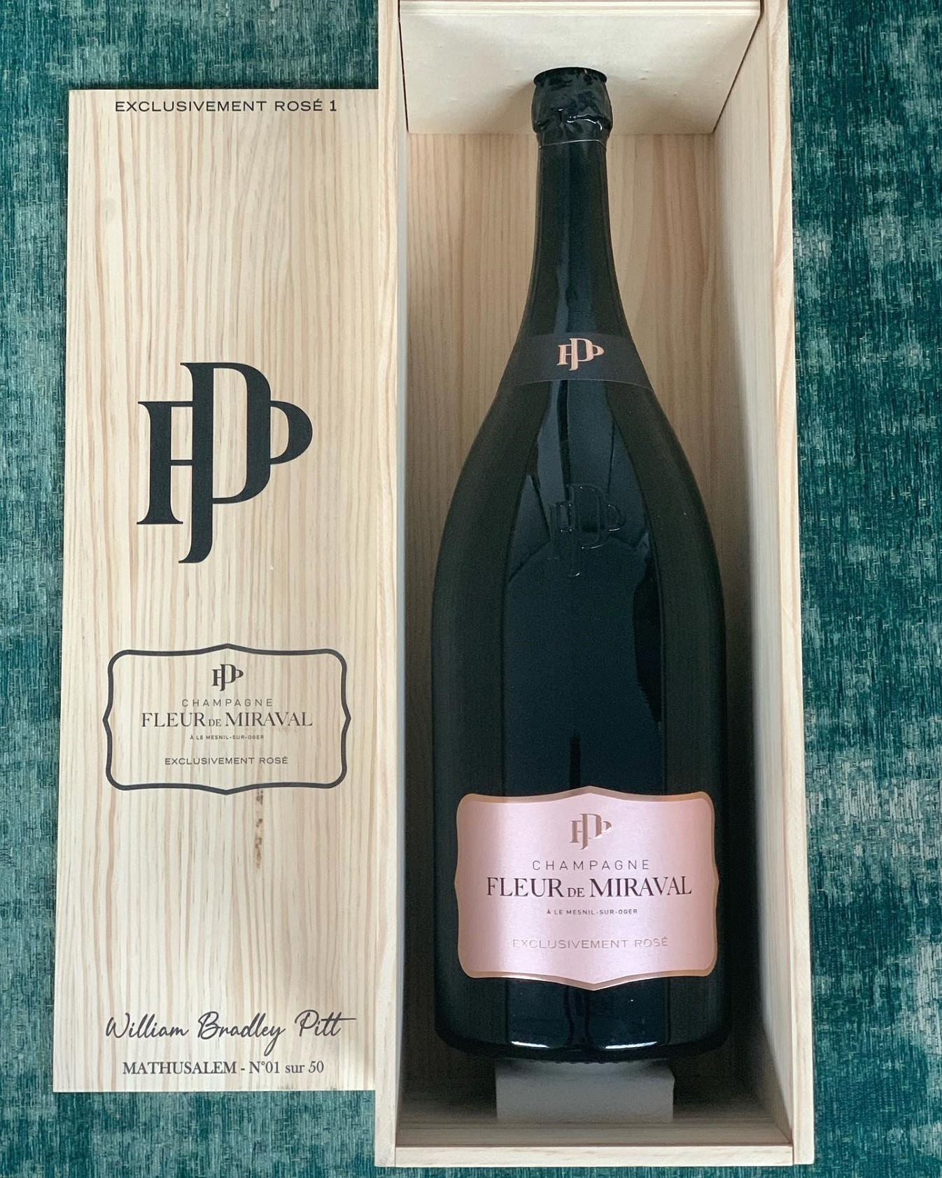 Εξωτερικά το μεγάλο ξύλινο κουτί με το λογότυπο της οικογένειας Περίν δείχνει απλά ότι στο εσωτερικό του αναπαύεται μια φιάλη Mathusalem, χωρητικότητας δηλαδή έξι λίτρων, μια από τις μόλις πενήντa που κυκλοφόρησαν σε όλο τον κόσμο, με τη ροζέ σαμπάνια Fleur de Miraval.
