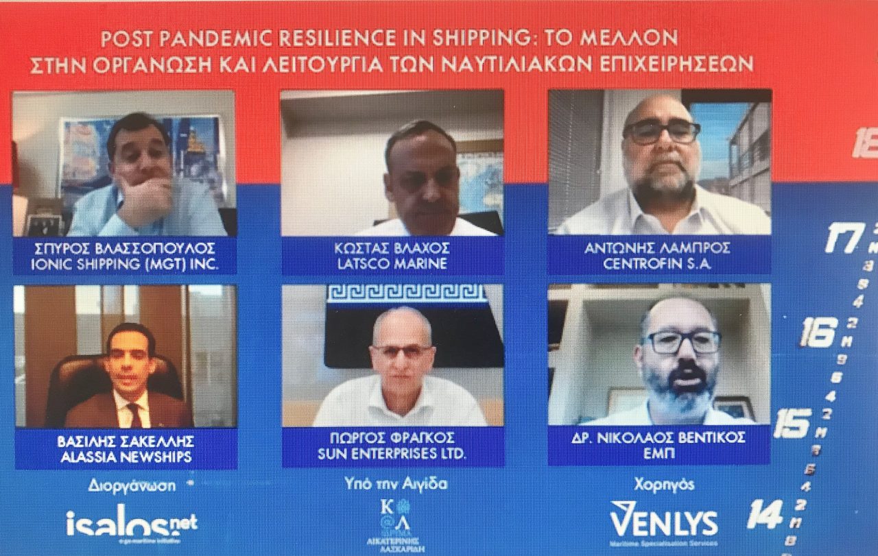Το webinar διοργάνωσε η Isalos.net, υπό την αιγίδα του Ιδρύματος Αικατερίνης Λασκαρίδη. Συμμετείχαν οι, Σπύρος Βλασσόπουλος, Managing Director, Ionic Shipping (Mgt) Inc. – Κώστας Βλάχος, COO, Latsco Marine Management Inc. – Αντώνης Λάμπρος, Director, Centrofin S.A. – Βασίλης Σακέλλης, Managing Director, Alassia NewShips Management Inc. – Γιώργος Φράγκος, Διευθύνων Σύμβουλος, Sun Enterprises Ltd. Τη συζήτηση συντόνισε ο Δρ. Νικόλαος Π. Βεντίκος, Αναπληρωτής Καθηγητής, Σχολή Ναυπηγών Μηχανολόγων Μηχανικών, Εθνικό Μετσόβιο Πολυτεχνείο.