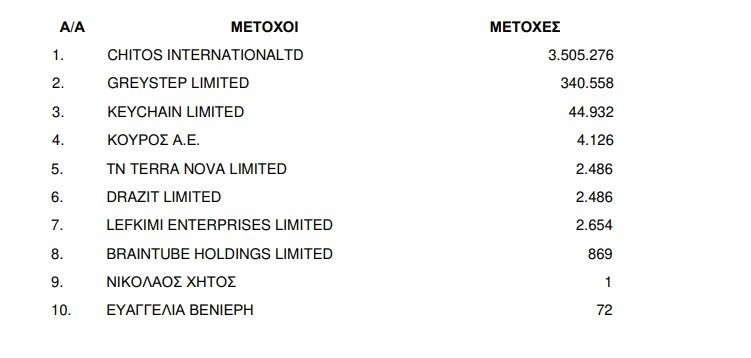 Οι μετοχές της Χήτος θα ακυρωθούν και οι παλαιοί μέτοχοι θα λάβουν μία νέα μετοχή για κάθε 0,66869764 παλαιές μετοχές. Δηλαδή οι μέτοχοι της Χήτος θα λάβουν συνολικά 3.505.277 νέες μετοχές σε αναλογία των 2.343.971 παλαιών μετοχών τους, ήτοι ποσοστό 89,80% επί του συνόλου του μετοχικού κεφαλαίου της.