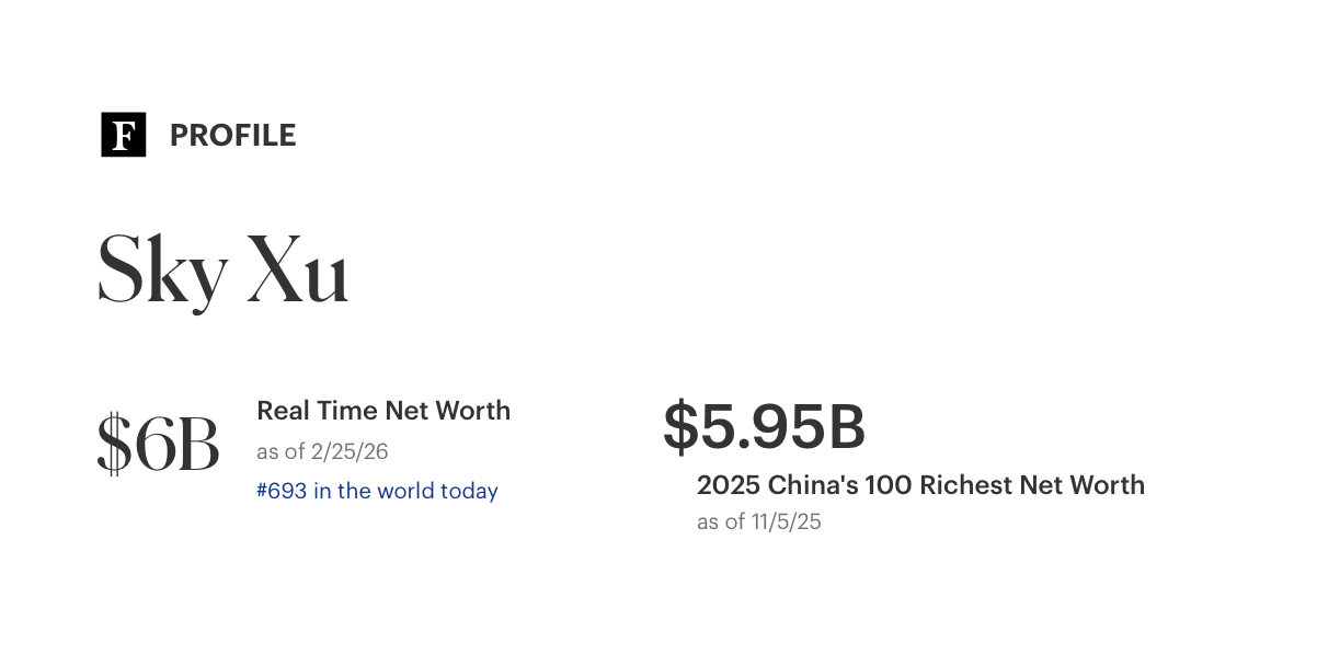Για παράδειγμα, το 2023 το Forbes εκτιμά, ότι η περιουσία του εκτινάχθηκε στα 10,5 δισ. δολάρια, ενώ για το 2025 υπολογίζεται περίπου στα 6 δισ. δολάρια. Μέχρι την ώρα που γράφονται αυτές οι γραμμές, ο Κρις ή Σκάι Σου είναι ο Νο 693 πλουσιότερος άνθρωπος στον κόσμο.