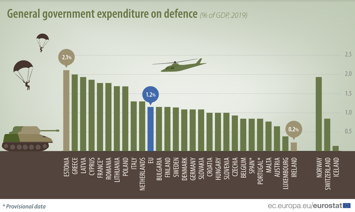 Σύμφωνα με την eurostat, το 2019, οι δαπάνες γενικής κυβέρνησης των κρατών μελών της ΕΕ για την άμυνα ανήλθαν σε 168,5 δισεκατομμύρια ευρώ, ποσοστό 2,6% των συνολικών δαπανών της γενικής κυβέρνησης και 1,2% του ΑΕΠ. Από το 2014, το μερίδιο των αμυντικών δαπανών στις συνολικές κρατικές δαπάνες αυξήθηκε ελαφρά.