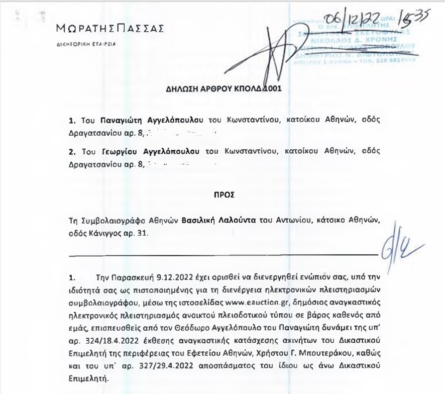 Υπενθυμίζεται πως μετά τη δημοσίευση των πλειστηριασμών στις 17 και 18 Οκτωβρίου οι Παναγιώτης και Γιώργος Αγγελόπουλος σε δήλωσή τους διευκρίνισαν, μεταξύ άλλων, ότι η απαίτηση που επιχειρεί να ικανοποιήσει ο θείος τους πηγάζει «από την αντιδικία που είχε επί σειρά ετών με τον πατέρα μας και δεν αφορά προσωπική μας οφειλή».