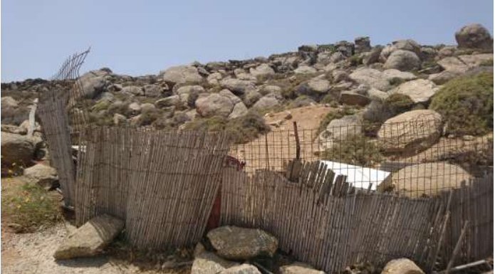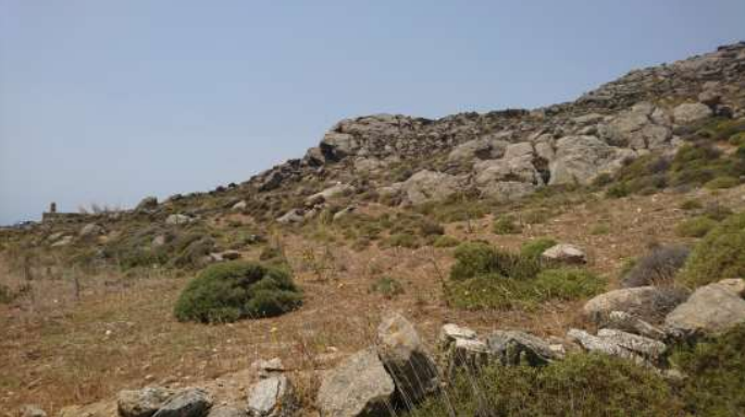 Το σχήμα του είναι ακανόνιστο ελλειψοειδές και το έδαφός του επικλινές με έντονη κλίση περί το 18%, ενώ η σύσταση του εδάφους είναι γαιώδης και κατά τόπους βραχώδης. Εντός του αγροτεμαχίου υπάρχει χαμηλή βλάστηση και οριοθετείται με ξερολιθιές, ενώ σε ορισμένα σημεία και με σιδηρό πλέγμα. Όπως αναφέρεται στην έκθεση εκτίμησης, βρίσκεται σε υψόμετρο περί τα 97 μέτρα από την επιφάνεια της θάλασσας και προσφέρει απεριόριστη θέα προς το Αιγαίο σε ορίζοντα προς τα νότια και ανατολικά του νησιού.