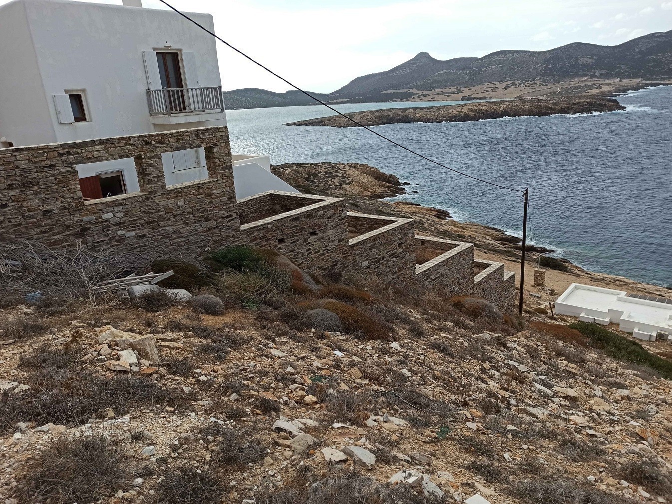 Εντός του ακινήτου υπάρχουν ημιτελή κτίσματα σε πολύ κακή κατάσταση. Τα κτίρια είναι διαβρωμένα και οι οπλισμοί έχουν οξειδωθεί. Συγκεκριμένα, υπάρχουν δυο συγκροτήματα με υπόσκαφα κτίρια 200 τ.μ. και 100 τ.μ. αντίστοιχα, 5 ορθογώνια κτίρια των 50 τ.μ. ένα θολωτό κτίριο 30 τ.μ. και τρία κτίρια χωρίς τη θολωτή στέγη.