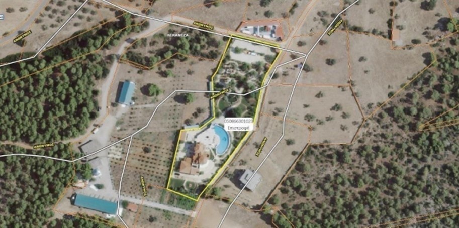 Πρόκειται ειδικότερα για μια διώροφη μονοκατοικία επιφάνειας 259,44 τ.μ., με υπόγειο επιφάνειας 251,40 τ.μ. και πισίνα 136 τ.μ. , ανεγερθείσα βάσει οικοδομικής άδειας του 2008, επί οικοπέδου (αγρού με ελαιόδεντρα), επιφάνειας 7.031,05 τ.μ., που βρίσκεται επί δύο αγροτικών οδών, στη θέση Λεκανέζα στη Μάνδρα Αττικής.