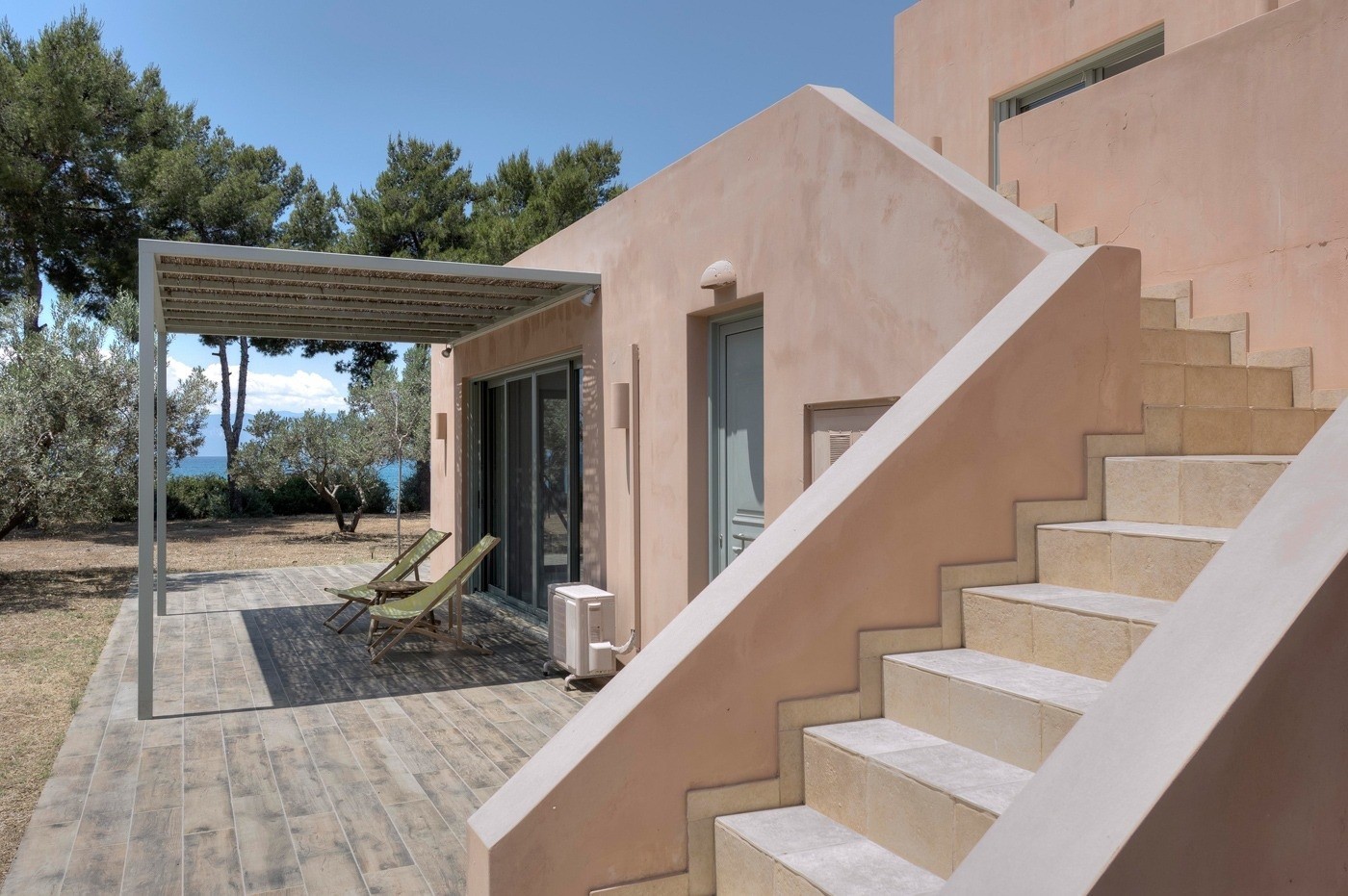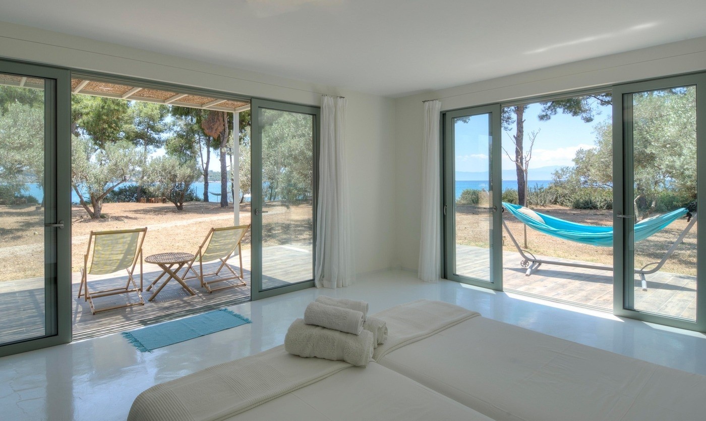 Οι χώροι είναι μεγάλοι, άνετοι και λιτοί. Είναι ένα σπίτι με μίνιμαλ αισθητική, με την απλότητα να εμπνέει για χαλάρωση και απόλαυση του απέραντου γαλάζιου. Τη ρωτώ αν έχει στήσει κι ένα εργαστήριο σε κάποιον χώρο και εκείνη χαμογελά με νόημα: «Οχι, γιατί δεν ήθελα να καταστρέψω το σπίτι. Τα εργαστήρια μοιάζουν συνήθως σαν να έχει πέσει βόμβα. Δεν ξέρω τι θα κάνω αργότερα, αλλά προς το παρόν απολαμβάνω αυτό το σπίτι μόνο για ξεκούραση και διακοπές».