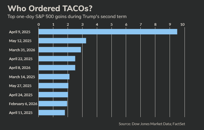 Όταν λίγο πριν το κλείσιμο της αγοράς την Μεγάλη Τρίτη εμφανίστηκαν πρωτοσέλιδα που υπονοούσαν πιθανή κατάπαυση του πυρός στη Μέση Ανατολή, ο S&P 500 και ο Nasdaq Composite σημείωσαν άμεση άνοδο, εξαλείφοντας τις προηγούμενες απώλειες, καθώς οι επενδυτές στοιχημάτισαν ότι ένα TACO από τον Τραμπ ενδέχεται να είναι επικείμενο.