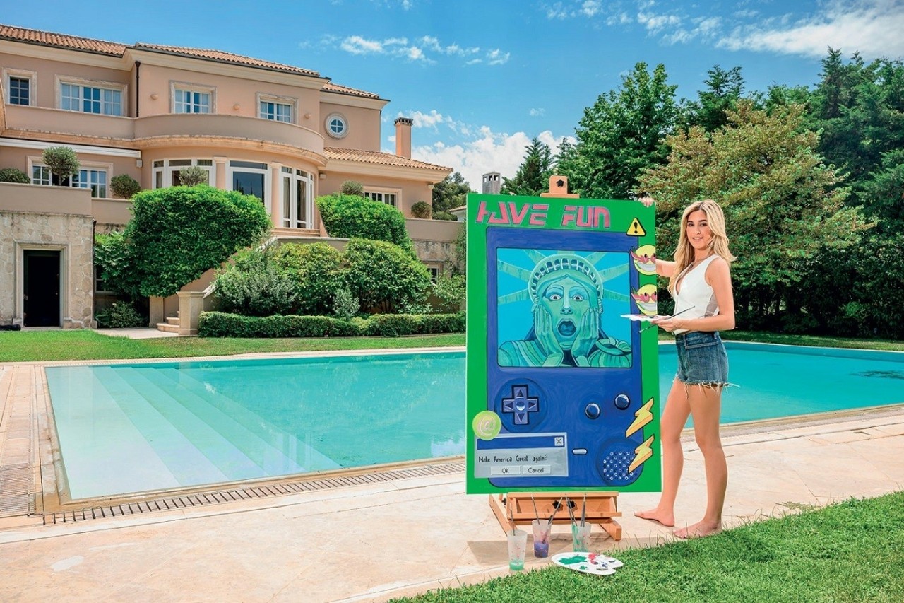 Συζητάμε χαλαρά καθώς περπατάμε στην προβλήτα της πιο κοσμοπολίτικης μαρίνας στη χώρα. «Βλέπω τα πράγματα από τη θετική τους πλευρά. Οντας αισιόδοξη φύση, μου αρέσει να μεταδίδω αισιόδοξα μηνύματα, πάντα με κάποιες αιχμές βέβαια, με φωτεινά, χαρούμενα και έντονα χρώματα γιατί η ζωή είναι ωραία ακόμη και με τις δυσκολίες και τα προβλήματά της. Η χρήση του χρώματος παραπέμπει πάντα στην παραδοσιακή ζωγραφική αλλά είναι εμποτισμένη με στοιχεία pop κουλτούρας που ενισχύουν την αίσθηση της ματαιότητας και της απόδρασης μέσω του παιχνιδιού. Για μένα, το μόνο μοιραίο λάθος που μπορεί να κάνει κανείς είναι να προσποιηθεί ότι δεν είναι μέρος αυτού του συνεχούς κρυφτού με την πραγματικότητα. Στο τέλος, τα υλικά αγαθά δεν είναι ποτέ αρκετά για να κρύψουμε τα παιχνίδια που παίζουμε και παίζονται στη ζωή».