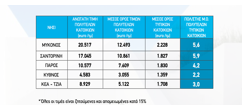 Ιδιαίτερα σημαντική είναι η διαφορά που καταγράφεται στις τιμές ζήτησης μεταξύ των μέσων όρων πολυτελών και τυπικών κατοικιών. Έτσι, στην Μύκονο μια πολυτελής κατοικία μπορεί να κοστίζει μέχρι και 5,6 φορές περισσότερο από μια τυπική θερινή κατοικία, στην Σαντορίνη 5,9 φορές, στην Πάρο 4,2 φορές, στην Κύθνο 2,2 φορές και στην Κέα 3 φορές.