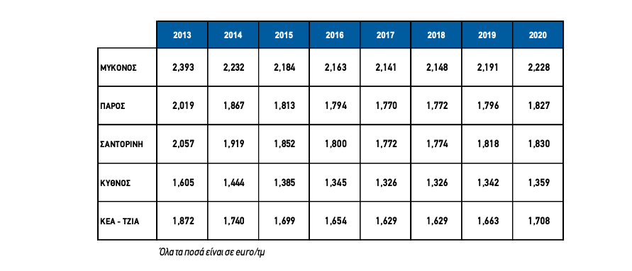 Σήμερα, η Μύκονος καταγράφει την υψηλότερη αξία μονάδος με 2.228 ευρώ /τμ και ακολουθεί η Σαντορίνη με 1.830 ευρώ /τμ και η Πάρος με 1.827 ευρώ /τμ. Η Τζιά καταγράφει 1.708 ευρώ /τμ και η Κύθνος 1.359 ευρώ /τμ..