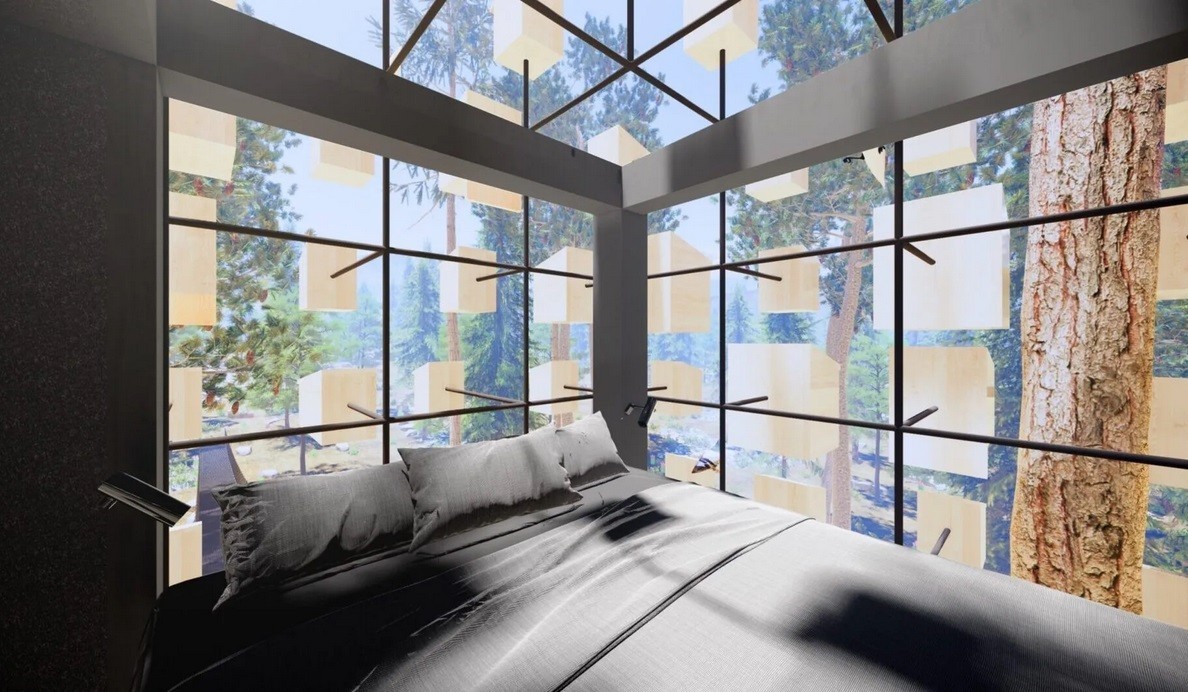 Το γυάλινο αρχιτεκτονικό θαύμα, που αναμένεται να ανοίξει για τους τουρίστες τον προσεχή Μάιο, είναι ουσιαστικά ένα εξελιγμένο, σφαιρικό δεντρόσπιτο που κρέμεται σαν υπερφυσική μπάλα ανάμεσα στα πεύκα και περιβάλλεται από 340 ξύλινα σπιτάκια πτηνών, προσφέροντας στους επισκέπτες ένα απολαυστικό ξύπνημα την αυγή, με τη μουσική από εκατοντάδες τιτιβίσματα πτηνών.