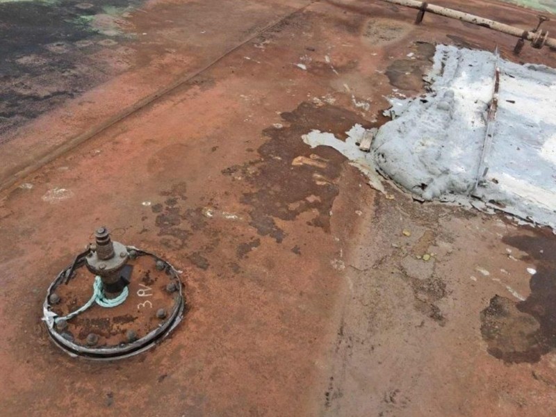 Σε άλλη φωτογραφία απεικονίζεται μία από τις εισόδους στις δεξαμενές φορτίου στην οποία είχαν τοποθετηθεί εκρηκτικά. Μετά την πυροδότησή τους, το κάλυμμά της καταστράφηκε και κατά την διαδικασία των αναγκαίων επισκευών για την αδρανοποίηση των δεξαμενών, το άνοιγμα σφραγίστηκε με διογκούμενη πολυουρεθάνη.