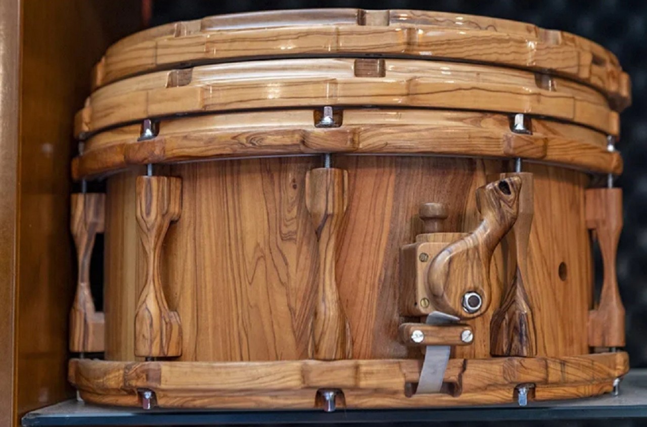 «Χρησιμοποιώ ελιά, σφένδαμο και πουρνάρι από την Αλόννησο και στη συνέχεια, αφού τα κόψω σε τάβλες, τα αποθηκεύω τουλάχιστον για τρία χρόνια για να ξηραθούν. Μετά ξεκινά το στάδιο της κατασκευής. Χρησιμοποιώ την μέθοδο κατασκευής stave, που σημαίνει ότι τα ξύλα είναι μασίφ κάθετα κομμάτια, τα οποία ενώνονται αρχικά με κόλλα και στη συνέχεια στον τόρνο, για να αποκτήσουν την απόλυτη κυκλική μορφή. Ακολουθεί το στάδιο του κουρδίσματος. Αν και για να φτιάξω ένα ταμπούρο, χρειάζομαι είκοσι ξύλινες τάβλες, θα πάρω 40-45 και μετρώντας την κάθε μία συχνότητα, θα επιλέξω τις 20 που ανταποκρίνονται στην ίδια συχνότητα. Αυτό σημαίνει ότι το κάθε ταμπούρο και κατά συνέπεια το κάθε drum set θα είναι πιο εύκολο στο κούρδισμα και βέβαια πολύ πιο σωστό τονικά».