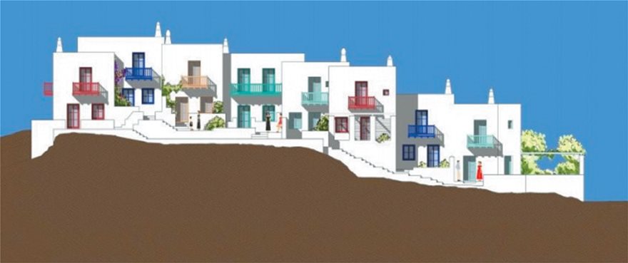 Επιπλέον, σκάλες που θα καταλήγουν στα στενά, θα οδηγούν σε δωμάτια πάνω από το επίπεδο του δρόμου. Τα δρομάκια αυτά θα είναι κατασκευασμένα με πλάκες πέτρινες, όπως είναι φτιαγμένα και τα σοκάκια της Μυκόνου. Εχει προβλεφθεί να υπάρχει και ένας φαρδύτερος δρόμος που θα καταλήγει στο καταφύγιο τουριστικών σκαφών και τον καλωδιοκίνητο επικλινή σιδηρόδρομο (τελεφερίκ) για τη μεταφορά των απαραίτητων αντικειμένων και αγαθών.