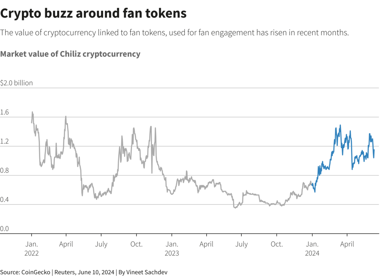 Η δραστηριότητα σε tokens που συνδέονται με τις συμμετέχουσες εθνικές ομάδες έχει αυξηθεί ενόψει του ευρωπαϊκού πρωταθλήματος ποδοσφαίρου Euro 2024, το οποίο ξεκινά την Παρασκευή και του Copa América στη Βόρεια και Νότια Αμερική που ξεκινά μια εβδομάδα αργότερα.