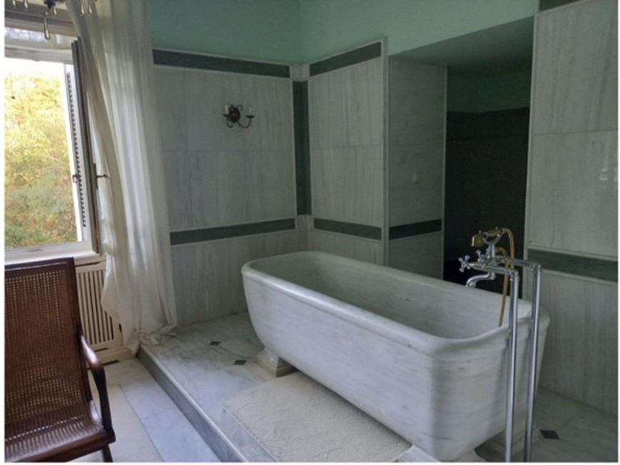 Το κυρίως λουτρό έχει μαρμάρινες επενδύσεις λευκής απόχρωσης στους τοίχους με περιμετρικές μπορντούρες σκούρας απόχρωσης σε γεωμετρικά σχήματα και η μπανιέρα είναι από λαξευμένο μάρμαρο.