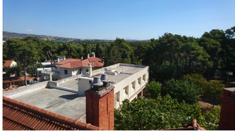 Σημειώνεται ότι ο περιβάλλων χώρος περιλαμβάνει πλακοστρωμένους διαδρόμους καθώς και φυτεύσεις με μεγάλα και αιωνόβια δένδρα όπως πλατάνια, πεύκα, κέδρους, κυπαρισσοειδή κ.α. Στο κεντρικό τμήμα του οικοπέδου, στα ανατολικά της κατοικίας, υπάρχει πισίνα ορθογώνιου σχήματος με ημικυκλική απόληξη στην μία πλευρά, ενώ διαθέτει περιμετρική κρυφή υπερχείλιση και εσωτερικό στεγανό φωτισμό στα πλευρικά τοιχώματα.