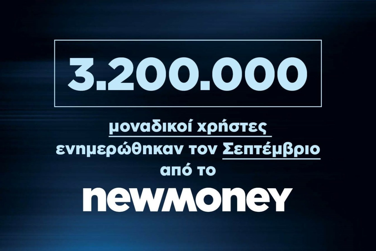 3.200.000 μοναδικοί χρήστες επέλεξαν το newmoney.gr και τον μήνα Σεπτέμβριο 2023 για να ενημερωθούν για όσα συνέβησαν στην οικονομία, στις επιχειρήσεις, στην κοινωνία και στις αγορές.