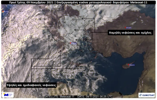 Σχετικά σπάνια εικόνα μας πρόσφερε ο μετεωρολογικός δορυφόρος Meteosat-11 το πρωί της Τρίτης 9 Νοεμβρίου 2021