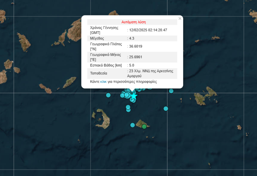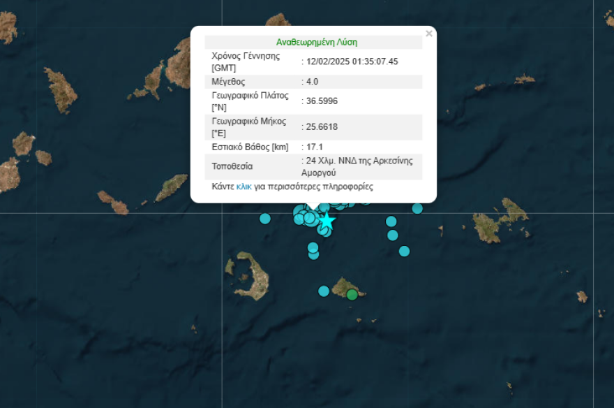 Η πιο «ισχυρή» από αυτές τις σεισμικές δονήσεις, μεγέθους 5 βαθμών της κλίμακας Ρίχτερ, καταγράφτηκε στις 03:14, κάπου 24 χιλιόμετρα νότια-νοτιοανατολικά της κοινότητας της Αρκεσίνης Αμοργού, σύμφωνα με την ίδια πηγή.