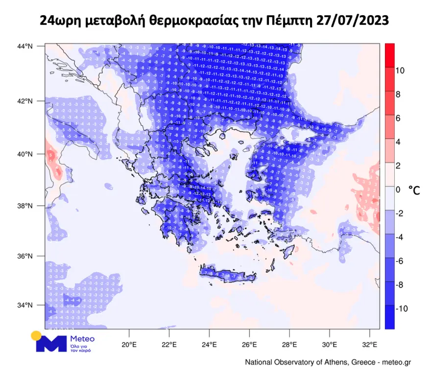 Ήδη από χθες το βράδυ δρόσισε στα βορειοδυτικά, ενώ οι μέγιστες τιμές θερμοκρασίας σήμερα προβλέπονται να υποχωρήσουν έως και 14 °C σε σχέση με τις αντίστοιχες τιμές της Τετάρτης 26/07. Η θερμοκρασία θα επανέλθει κοντά στον μέσο κλιματικό όρο, δηλαδή τη μέση τιμή της περιόδου 1991-2020.
