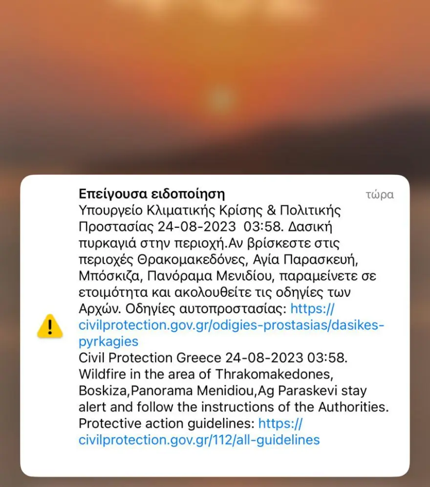 Επίσης, ειδοποιήθηκαν οι κάτοικοι των περιοχών Θρακομακεδόνες, Μπόσκιζα και Πανόραμα Μενιδίου να είναι σε ετοιμότητα και να ακολουθούν τις υποδείξεις των αρχών.