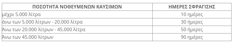 Οι ημέρες σφράγισης, ανάλογα με την ποσότητα των νοθευμένων καυσίμων, που θα προκύπτει από τον εργαστηριακό έλεγχο του Γενικού Χημείου του Κράτους, είναι οι εξής: