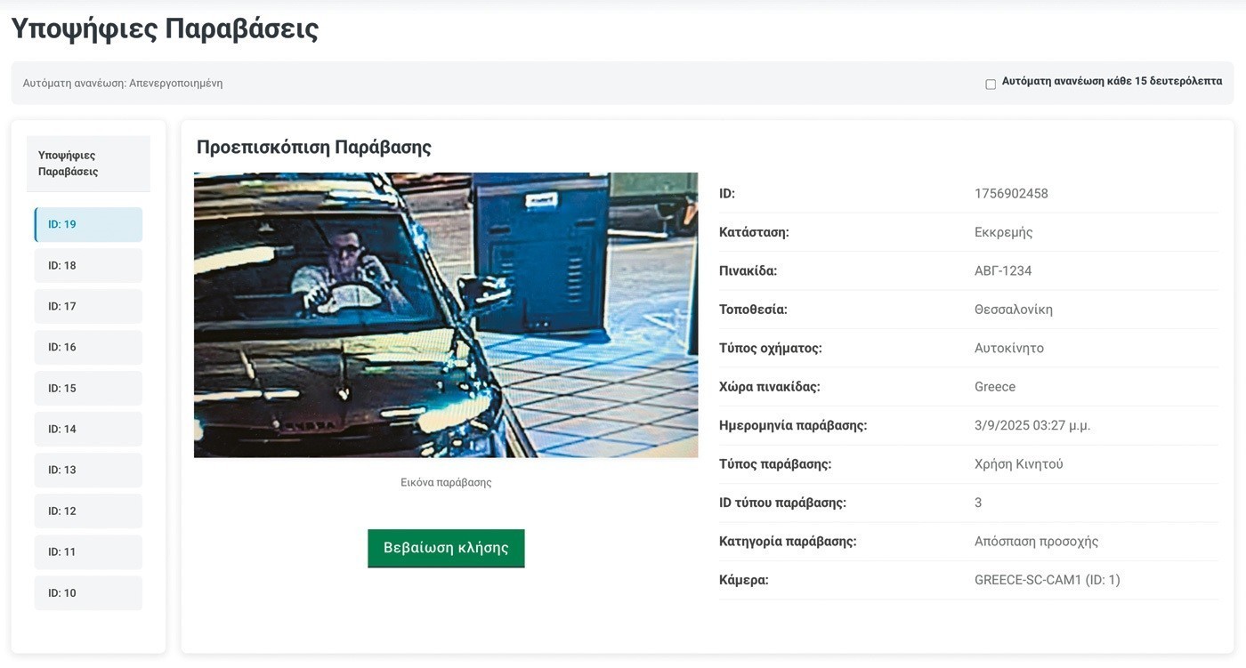 Το νέο σύστημα που θα κόβει κλήσεις αυτόματα στους παραβάτες οδηγούς αλλά και όλα τα τεχνολογικά μέτρα για την οδική ασφάλεια παρουσιάστηκαν με διαδραστικό τρόπο από το υπουργείο Ψηφιακής Διακυβέρνησης στο περίπτερο 12 κατά τη διάρκεια της 89ης Διεθνούς Εκθεσης Θεσσαλονίκης. Εντός του περιπτέρου υπήρχαν ένα αυτοκίνητο και μια κάμερα η οποία σε πραγματικό χρόνο καταγράφει παραβάσεις, όπως η μη χρήση ζώνης και η χρήση κινητού τηλεφώνου κατά την οδήγηση, αναδεικνύοντας τον ρόλο της τεχνολογίας στην προστασία της ανθρώπινης ζωής. Παράλληλα θα υπάρχει οθόνη που θα δείχνει ότι ο οδηγός του αυτοκινήτου έχει παραβιάσει τον ΚΟΚ για τις δύο παραπάνω περιπτώσεις. Η κυβέρνηση προωθεί μια σημαντική μεταρρύθμιση στον τομέα της οδικής ασφάλειας μέσω της αξιοποίησης ψηφιακών τεχνολογιών και Τεχνητής Νοημοσύνης, που υλοποιείται από το υπουργείο Ψηφιακής Διακυβέρνησης και Τεχνητής Νοημοσύνης, σε συνεργασία με τα υπουργεία Υποδομών και Μεταφορών και Προστασίας του Πολίτη.