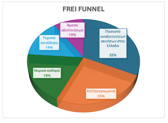 Με βάση το διάγραμμα του Frei Funnel που αξιοποιεί κατά την διαδικασία ψηφιακής χαρτογράφησης και αξιολόγησης ακινήτων η BluPeak Estate Analytics, το 32% αφορά το συνολικό απόθεμα των ακινήτων που παραμένουν αναξιοποίητα από το σύνολο των ακινήτων που υφίστανται στην Ελλάδα. Από αυτή τη δεξαμενή, μόλις το 25% εμφανίζεται ως καταγεγραμμένο, γεγονός που δείχνει ήδη μια πρώτη απώλεια ορατότητας και οργανωμένης πληροφόρησης για την πραγματική κατάσταση της αγοράς.