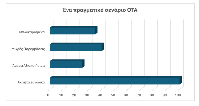 Η μεγάλη εικόνα της δημοτικής ακίνητης περιουσίας συχνά δημιουργεί την εντύπωση ότι οι ΟΤΑ διαθέτουν σημαντικά περιθώρια παρέμβασης στο στεγαστικό και στην τοπική ανάπτυξη. Όμως η πραγματικότητα είναι πολύ πιο σύνθετη. Το ενδεικτικό σενάριο που αποτυπώνεται στο σχετικό γράφημα που παραθέτει η BluPeak Estate Analytics δείχνει ότι από ένα σύνολο 100 ακινήτων, μόνο ένα μικρό μέρος μπορεί να αξιοποιηθεί άμεσα, ενώ ένα σημαντικό ποσοστό παραμένει παγωμένο ή χρειάζεται προηγουμένως διορθωτικές κινήσεις.