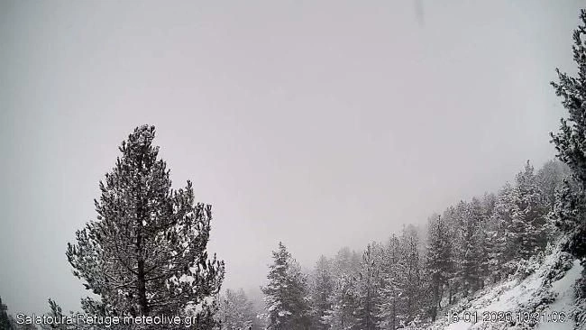 Σύμφωνα με το meteo.gr, την ώρα που σε χαμηλά και μεσαία υψόμετρα σημειώνονται χιονοπτώσεις — ακόμη και κάτω από τα 500 μέτρα — στις υψηλότερες κορυφές του Ολύμπου ο καιρός παραμένει αίθριος, με έντονη ηλιοφάνεια.