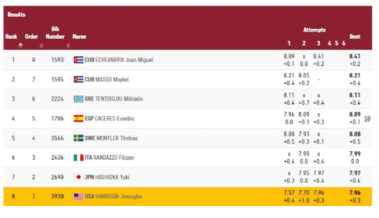 Πολύ καλό και το πέμπτο άλμα του Έλληνα στα 8,15μ που τον φέρνει στην 3η θέση, γιατί έχει καλύτερη δεύτερη προσπάθεια από τον Χάρισον που έχει επίσης 8.15. Ωστόσο ο Ισπανός Κάθερες με άλμα στα 8.18 περνάει τρίτος, βάζοντας τον Τεντόγλου στην 4η θέση.