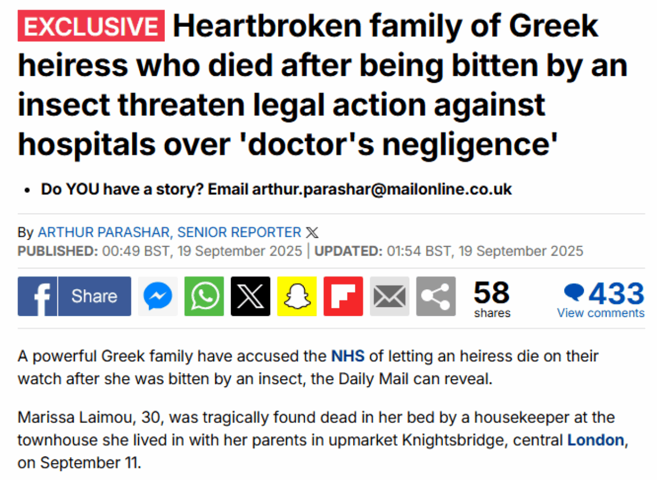 Το δημοσίευμα της Daily Mail για τον θάνατο της Μαρίσσας Λεμού