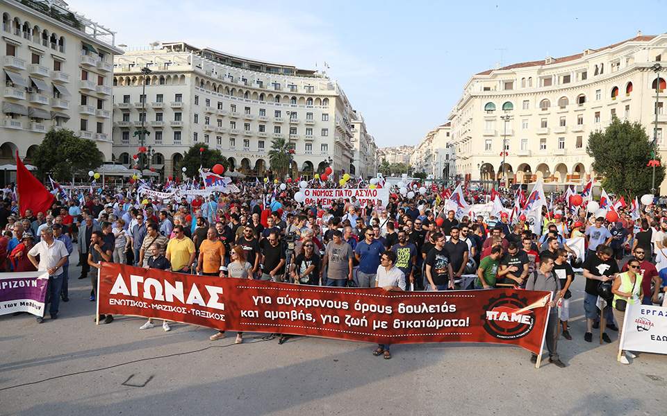 Συλλαλητήρια των συνδικάτων, με συγκεντρώσεις και πορείες στο κέντρο της Θεσσαλονίκης και με αιτήματα για εργασία με δίκαιους όρους αμοιβής, καλύτερες συνθήκες δουλειάς, καλύτερες συντάξεις, εργατικά και κοινωνικά δικαιώματα, πραγματοποιούνται με αφορμή τη διεξαγωγής της 84ης Διεθνούς Έκθεσης.