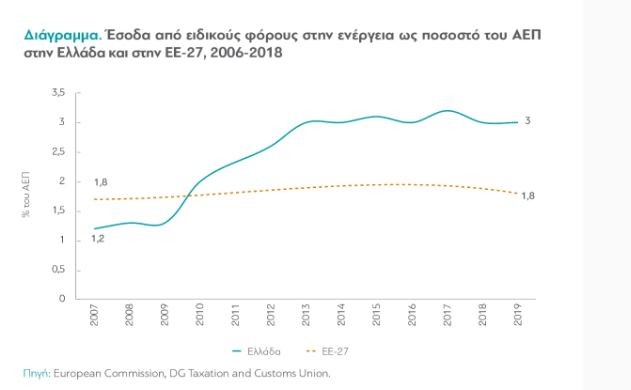 Αξίζει δε να αναφέρουμε ότι ο κλάδος της ενέργειας έχει πολύ μεγάλη σημασία και για τα δημόσια έσοδα. Το 64% της τιμής της αμόλυβδης βενζίνης είναι δασμοί ή φόροι, για παράδειγμα. Τα έσοδα από τους ειδικούς φόρους στην ενέργεια έφταναν το 3% του ΑΕΠ το 2019, έναντι 1,8% που είναι ο ευρωπαϊκός μέσος όρος. Αυτό, μάλιστα είναι κάτι που άλλαξε από το 2010 και την αρχή της κρίσης και μετά.