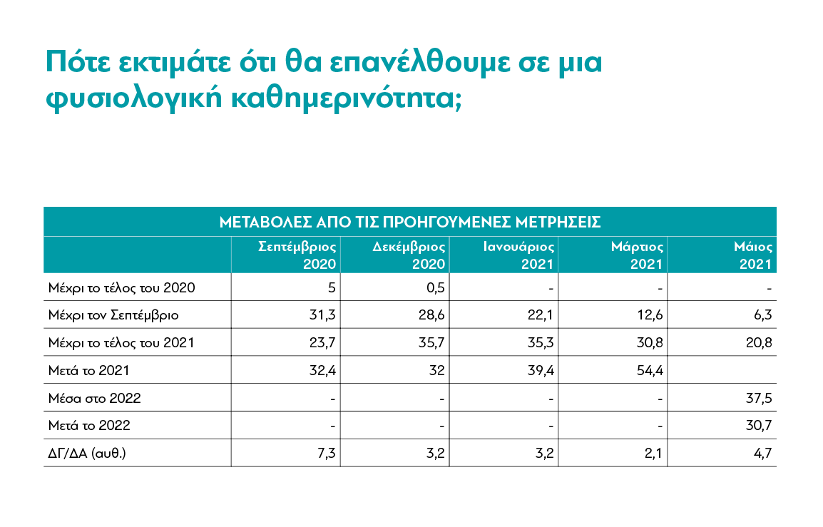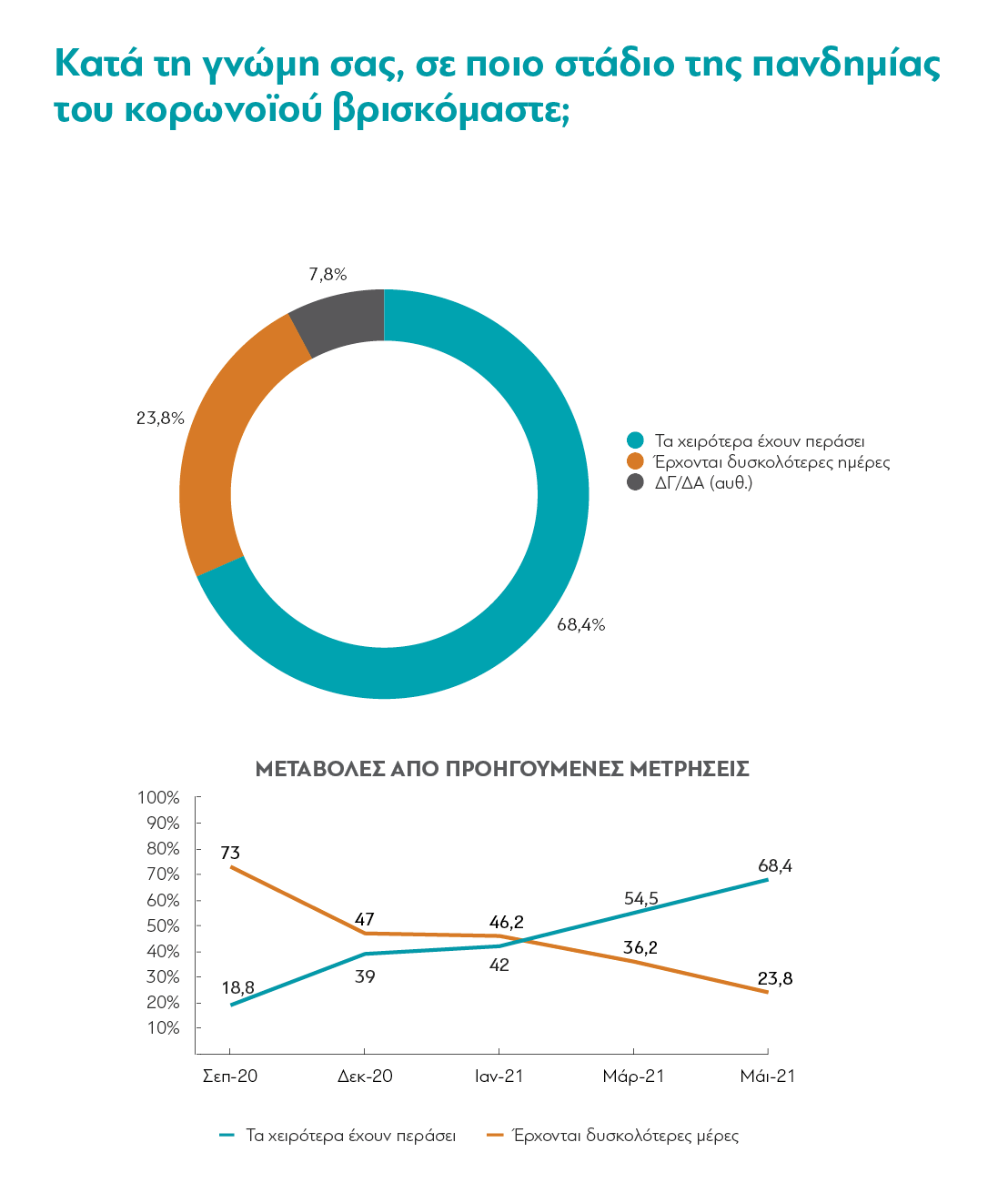 Σε αυτή τη νέα φάση της κρίσης είδαμε το τέλος του πολύμηνου lockdown στις περισσότερες περιοχές της χώρας, με τη σταδιακή άρση πολλών από τα περιοριστικά μέτρα που ίσχυαν το προηγούμενο διάστημα, αλλά και τη ραγδαία επιτάχυνση του προγράμματος εμβολιασμού, με περίπου 100.000 νέους εμβολιασμούς ημερησίως (εκτός Κυριακής). Σε αυτή τη συγκυρία, διαπιστώνουμε ότι οι ζωές αλλά και οι απόψεις και οι προσδοκίες των Ελλήνων αλλάζουν και πάλι. Αξίζει να μελετήσουμε το πώς.