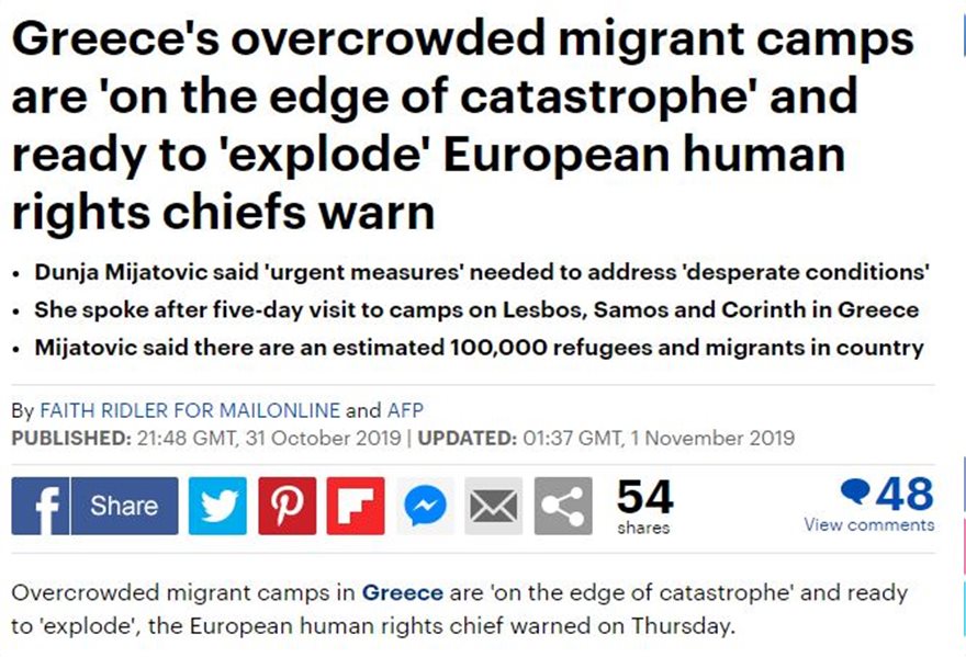 «Οι υπερπλήρεις προσφυγικοί καταυλισμοί στην Ελλάδα βρίσκονται “στο χείλος της καταστροφής και είναι έτοιμοι να εκραγούν”», όπως προειδοποιούν οι επικεφαλής των ανθρωπίνων δικαιωμάτων, αναφέρει δημοσίευμα της βρετανικής εφημερίδας «Daily Mail». Η επικεφαλής των Ανθρωπίνων Δικαιωμάτων στην Ευρώπη Dunja Mijatovic δήλωσε χθες ότι «πρέπει να ληφθούν επειγόντως μέτρα για την αντιμετώπιση των απαράδεκτων συνθηκών».