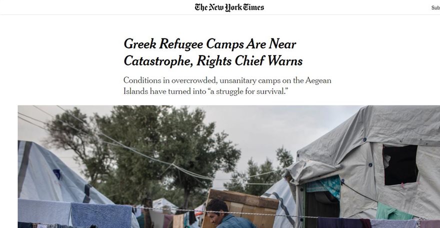 «Στο χείλος της καταστροφής βρίσκονται οι προσφυγικοί καταυλισμοί στην Ελλάδα, ενώ οι συνθήκες στα ανθυγιεινά hot spot έχουν μετατρέψει την καθημερινότητα των μεταναστών και προσφύγων σ’ έναν αγώνα επιβίωσης», σχολιάζει η αμερικανική εφημερίδα New York Times.