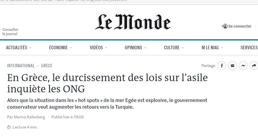«Από τις αρχές Σεπτεμβρίου, δεν έχει περάσει ούτε μία εβδομάδα στην Ελλάδα χωρίς να συμβεί κάτι στους προσφυγικούς καταυλισμούς που βρίσκονται στα νησιά του Αιγαίου ή στην ηπειρωτική χώρα», γράφει η γαλλική εφημερίδα «Le Monde». «Για πρώτη φορά από το 2016, η Ελλάδα έγινε φέτος η κύρια πύλη για τους μετανάστες στην Ευρώπη, με αυξημένη ροή από τη γειτονική Τουρκία. Αλλά το σχέδιο της κυβέρνησης προκαλεί έντονη κριτική στις ΜΚΟ που βρίσκονται στα νησιά», προσθέτει το δημοσίευμα.