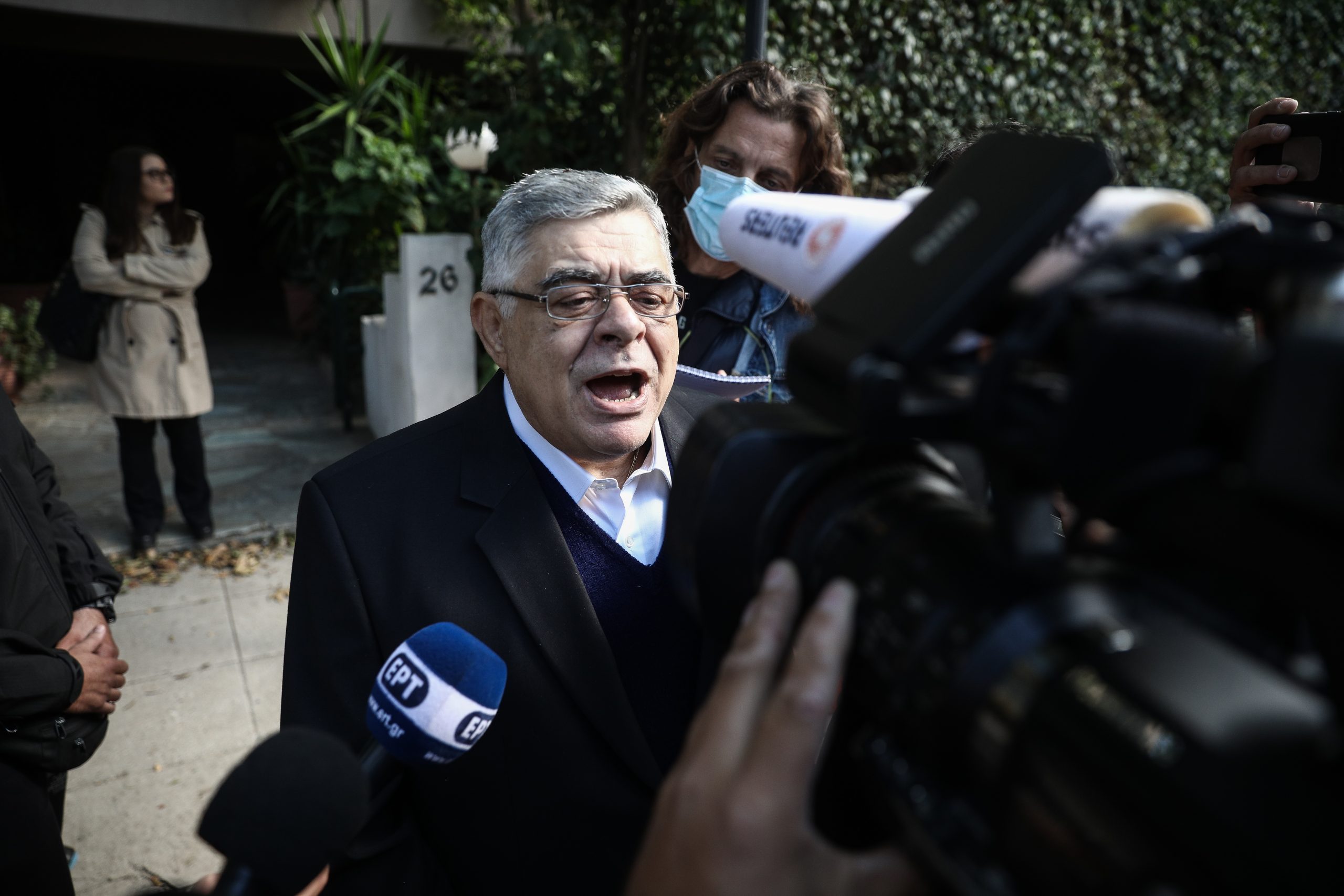 Ο Νίκος Μιχαλολιάκος βγήκε από το σπίτι του και δήλωσε περήφανος που πηγαίνει φυλακή για τις ιδέες του. Μαζί του ήταν η Ελένη Ζαρούλια, η κόρη του, Ουρανία και τέσσερις-πέντε οπαδοί του.