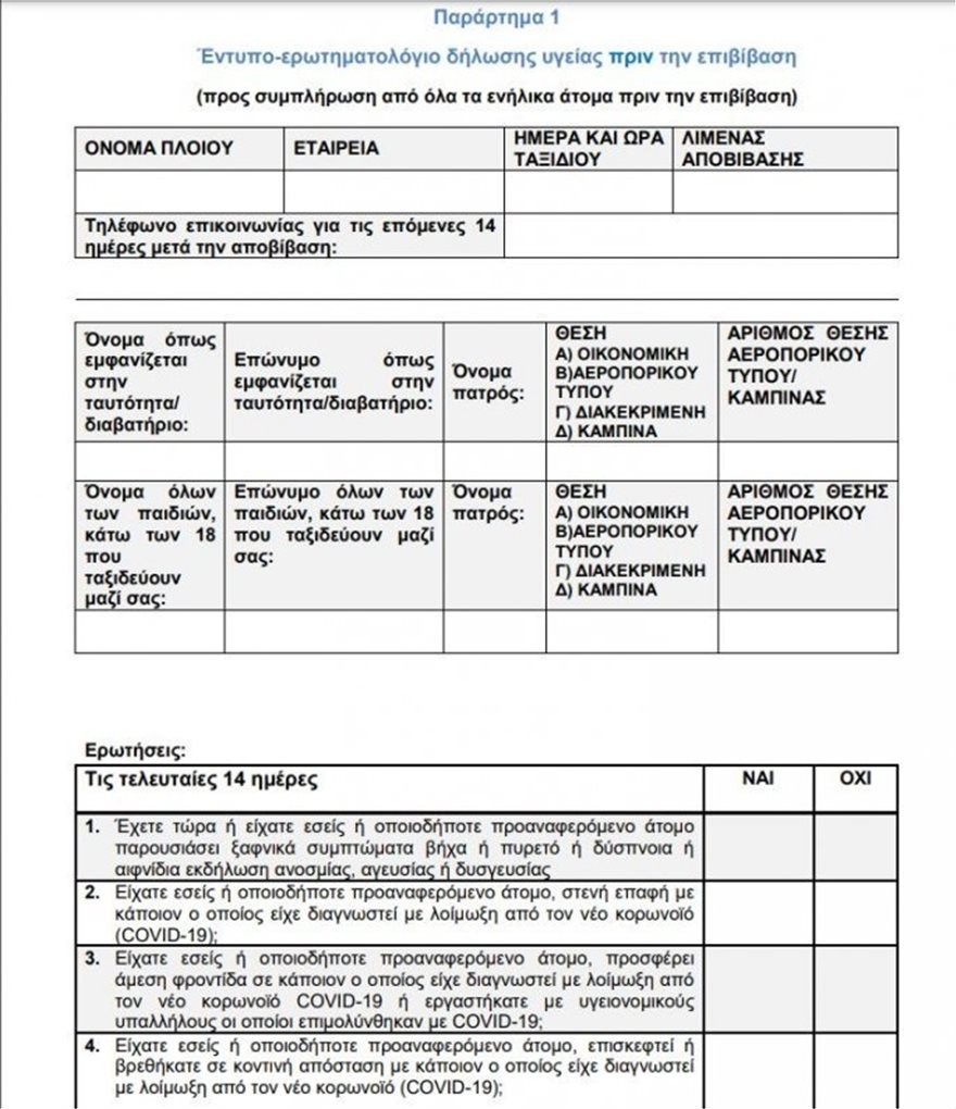 Το αναθεωρημένο έγγραφο, με την επωνυμία «Δήλωση Υγείας Επιβατών», με το οποίο μπορεί κάποιος να ταξιδεύει με πλοίο της γραμμής, έδωσε στη δημοσιότητα το υπουργείο Ναυτιλίας και Νησιωτικής Πολιτικής.