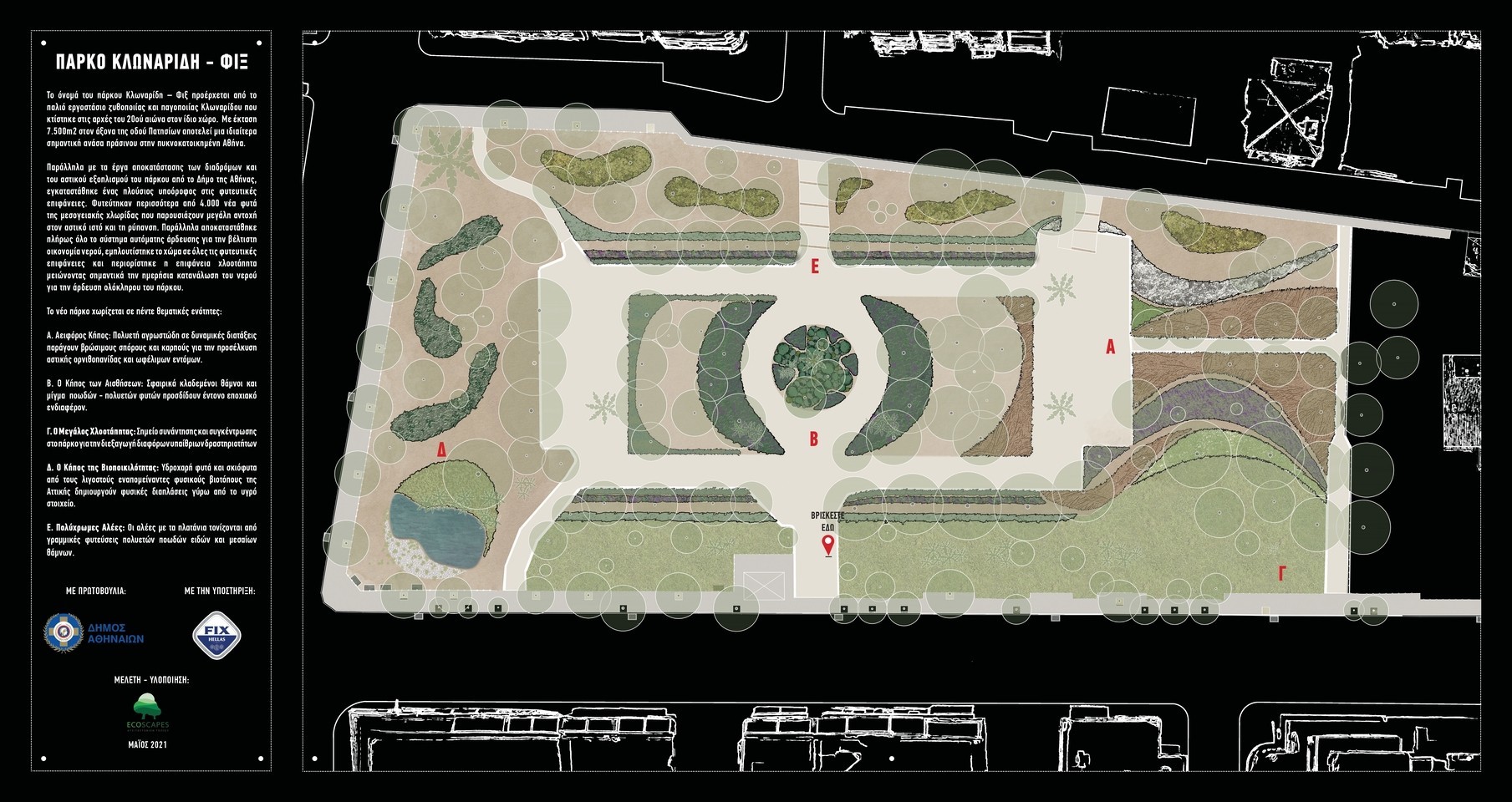 Το πάρκο Κλωναρίδη-Φιξ μάς «ξανασυστήνεται» υπό τη νέα του, ριζικώς ανανεωμένη μορφή, ως σύγχρονο αειφόρο αστικό πάρκο, με δομή και φύτευση βάσει των διεθνών τάσεων αρχιτεκτονικής τοπίου και περιβαλλοντικού σχεδιασμού.