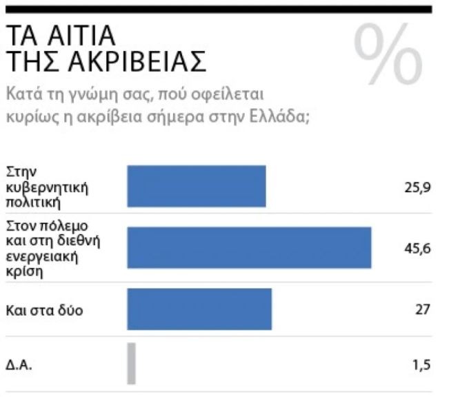 Με εξαίρεση, ωστόσο, τους οπαδούς του ΣΥΡΙΖΑ, μεταξύ των οποίων υπερτερεί, σε ποσοστό 42,1%, η άποψη ότι υπεύθυνη για την ακρίβεια είναι η κυβερνητική πολιτική, στο σύνολο της κοινής γνώμης η πλειονότητα, σε ποσοστό 45,6%, θεωρεί ότι το αίτιο για τις ανατιμήσεις είναι ο πόλεμος και η διεθνής ενεργειακή κρίση.