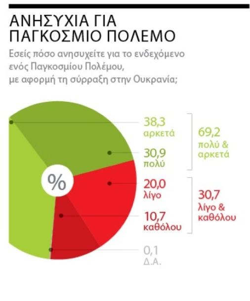 Με εξαίρεση όσους αυτοπροσδιορίζονται ως αριστεροί, οι οποίοι ενστερνίζονται τους ισχυρισμούς του Κρεμλίνου, όλες οι άλλες κοινωνικές, ηλικιακές και ιδεολογικές ομάδες τάσσονται πλειοψηφικά με την πλευρά του Κιέβου. Υπό αυτό το πνεύμα, περισσότεροι από έξι στους δέκα Ελληνες δηλώνουν σύμφωνοι με τις κυρώσεις κατά της Μόσχας, έναντι του 29,6% που εκφράζει αντίθεση. Επτά στους δέκα, τέλος, εκφράζουν ανησυχία ότι η σύγκρουση μπορεί να οδηγήσει σε έναν Παγκόσμιο Πόλεμο, ενώ με ψυχραιμία αντιμετωπίζει την κατάσταση το 30,7% των ερωτηθέντων. Ακρως χαρακτηριστικές είναι, τέλος, οι απαντήσεις που δίνουν οι πολίτες σε ερώτημα σχετικό με τις ελληνοτουρκικές σχέσεις.
