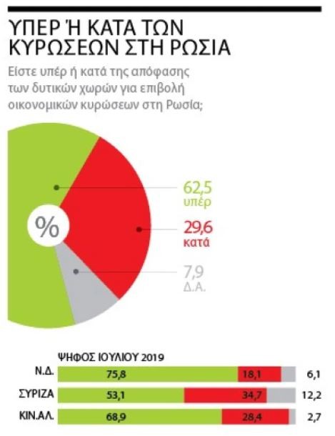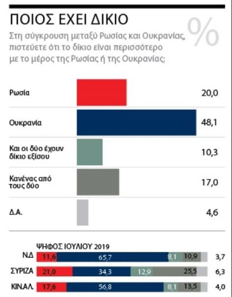Δίκαιες οι κυρώσεις της Δύσης στη Ρωσία ■ Στο πλευρό της Ουκρανίας τάσσεται η πλειοψηφία των Ελλήνων ■ Υπέρ της Μόσχας όσοι αυτοπροσδιορίζονται ως αριστεροί ■ Ναι στον διάλογο της Αθήνας με την Αγκυρα